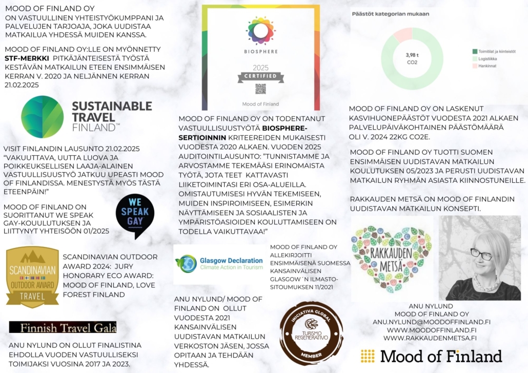 Mood of Finland on vastuullinen kumppani matkailu- ja koulutuspalveluissa. Tarjoamme luovia ja innostavia matkailu- ja koulutuspalveluita, olemme luotettava ja vastuullinen kumppani kehittämisprojekteissa ja innostava matkailupalvelujen kehittäjä ja toteuttaja.